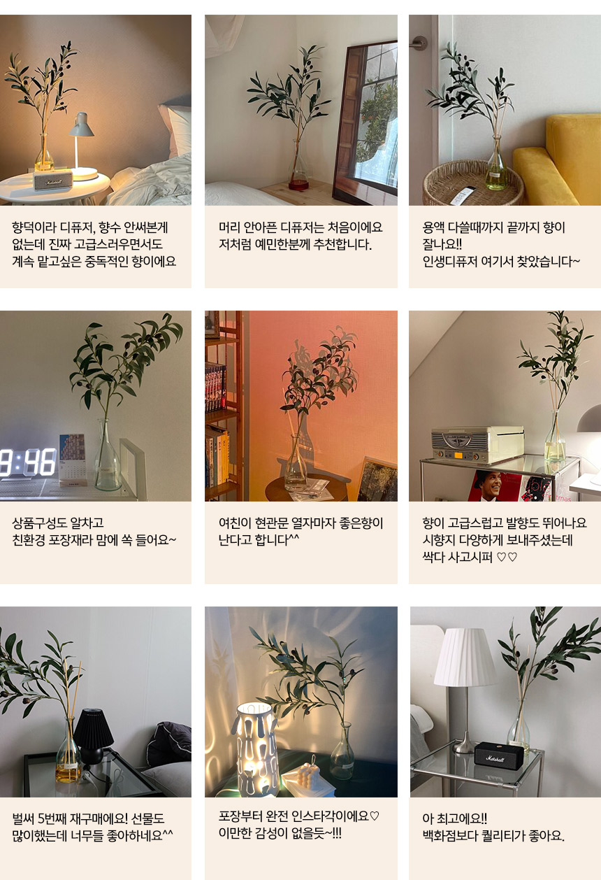 * 향기는 익숙해짐에 따라 발향이 덜하게 느껴질 수 있습니다. 새로운 공간으로 위치를 옮기거나 다른 향기와 번갈아 사용하시면 꾸준한 발향을 느낄 수 있습니다.
