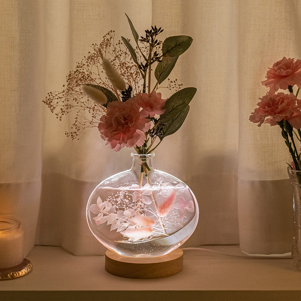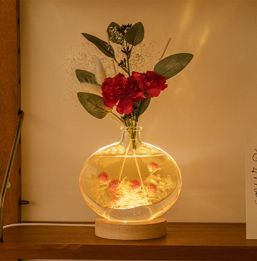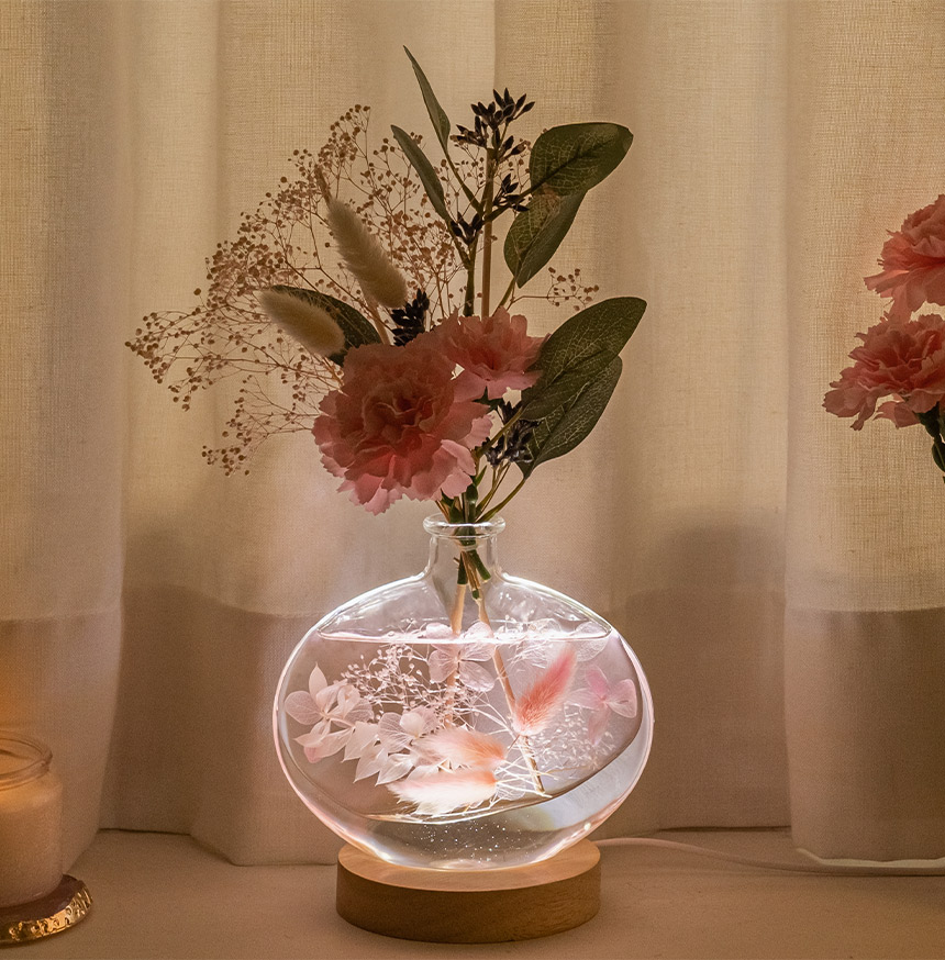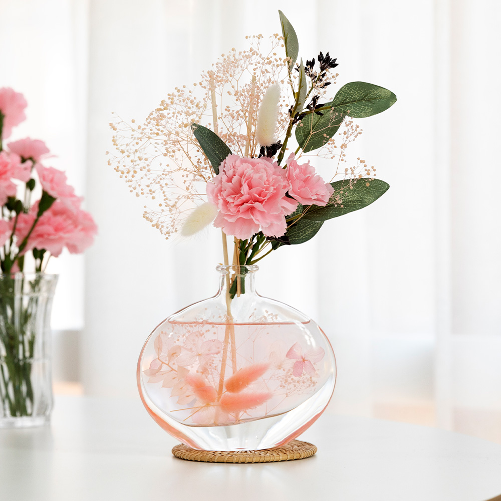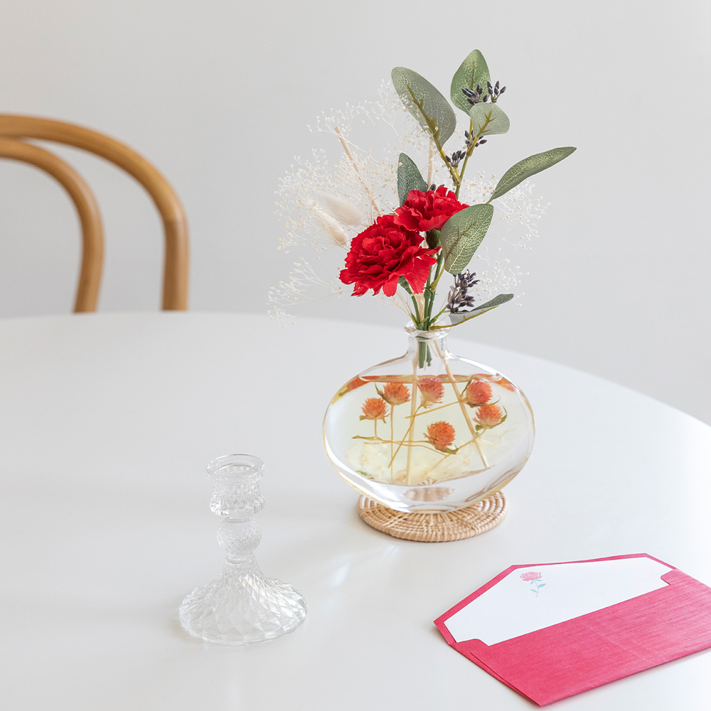 시들지 않는 프리저브드 플라워를 투명한 유리병에 담아 생화의 아름다움을 오랫동안 감상할 수 있습니다.
