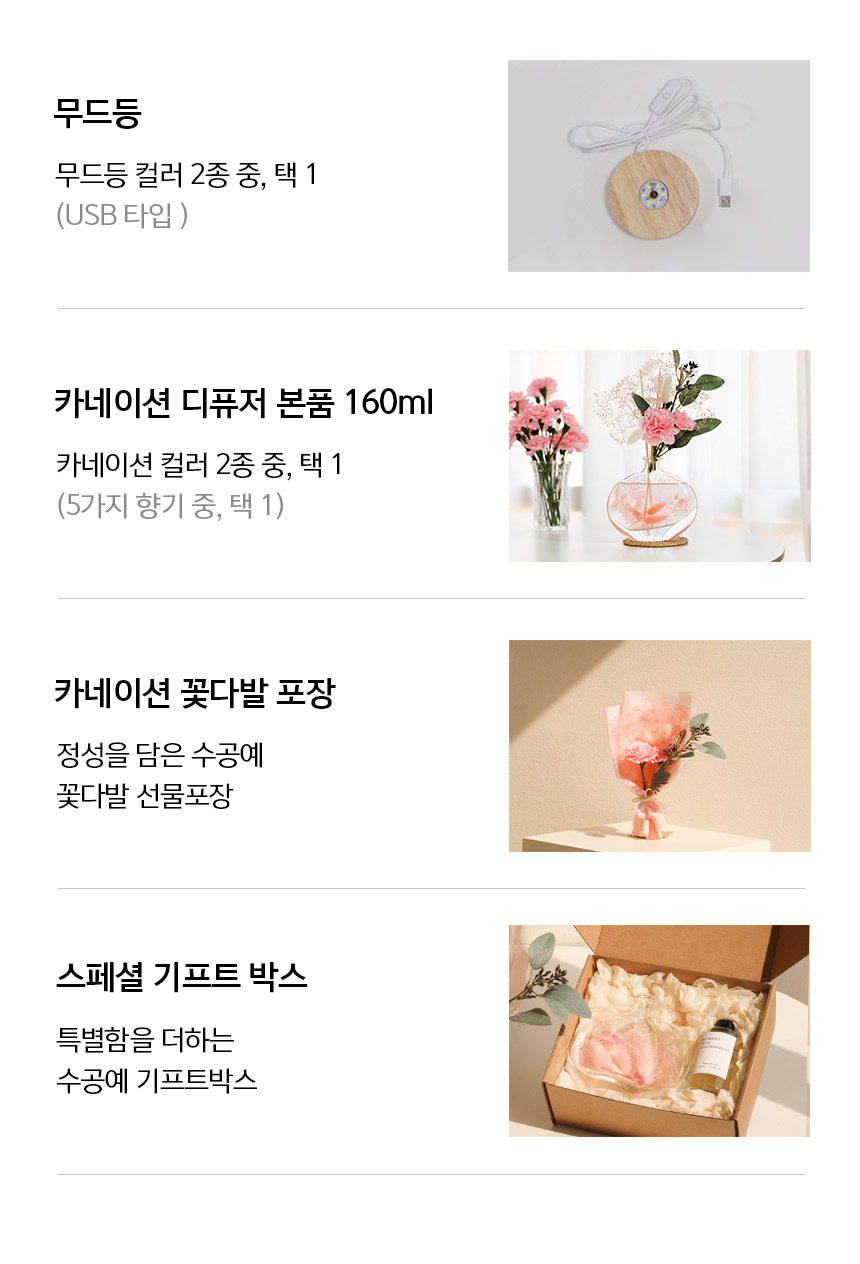 프리미엄 카네이션 조화에 수공예 선물포장이 더해져 정성을 가득 담은 향기 선물로 감동을 선사합니다.