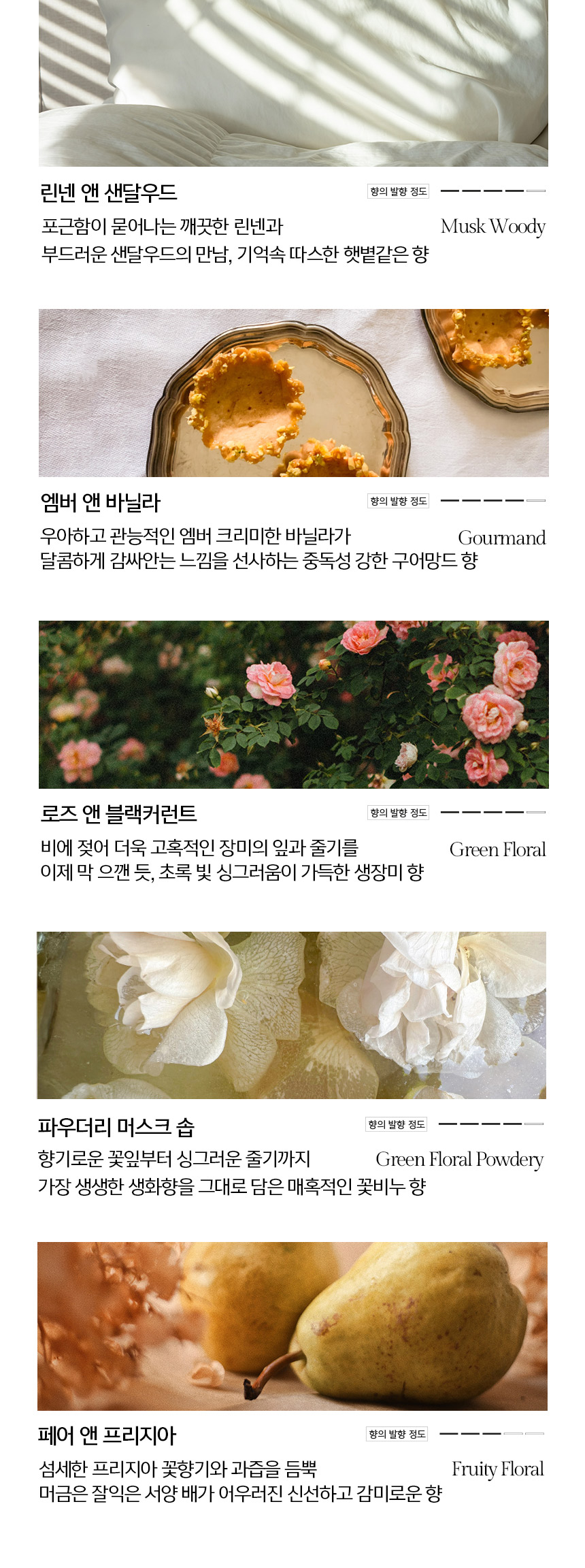 국제향료협회 IFRA 가이드를 준수한 프리미엄 에센셜 오일을 가장 높은 부향률로 담아 처음부터 끝까지 풍부하게 발향됩니다.