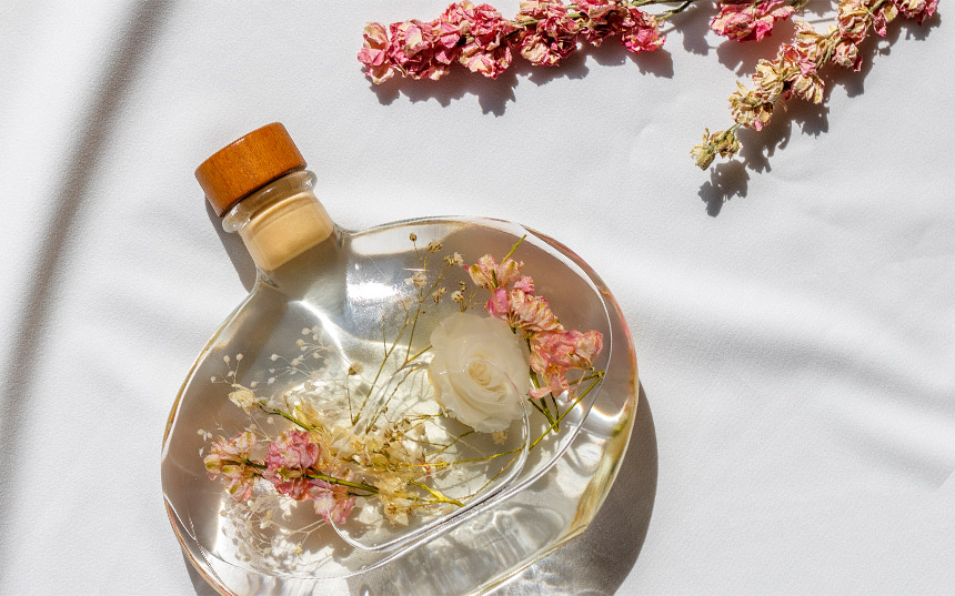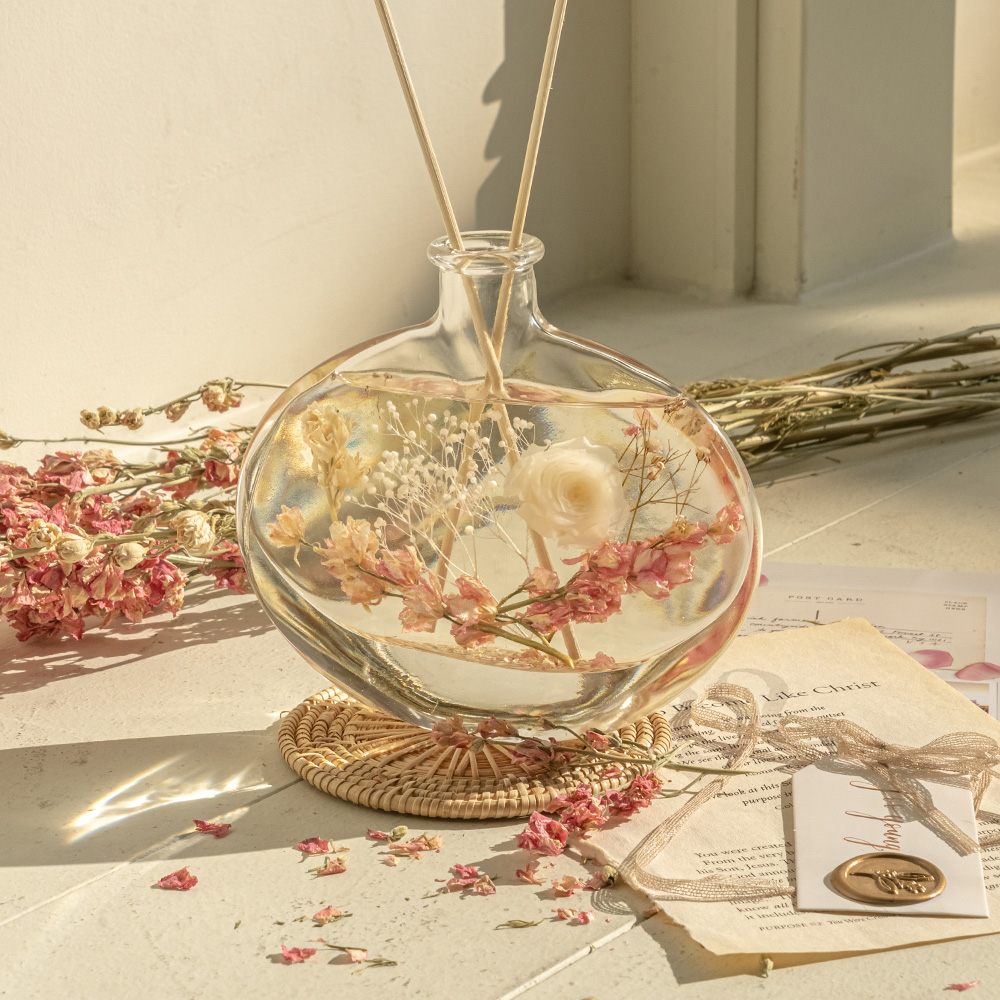 시들지 않는 프리저브드 플라워를 투명한 유리병에 담아 생화의 아름다움을 오랫동안 감상할 수 있습니다.
